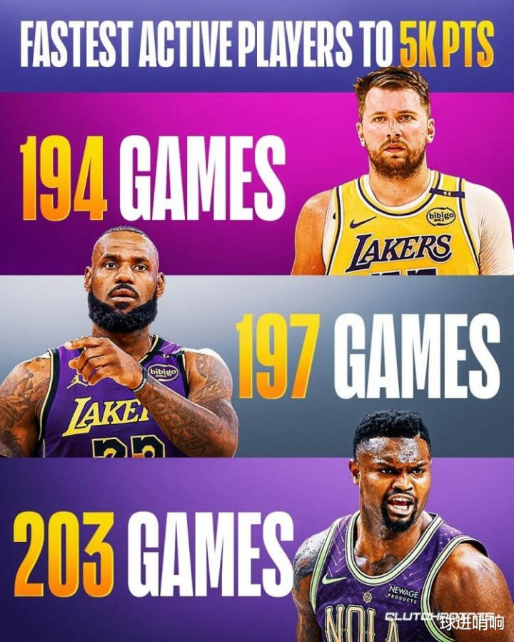 此外,锡安得分也在第203场时达到5000分,成为现役第三快,成功比肩东契奇(194场)与詹姆斯(197场)。