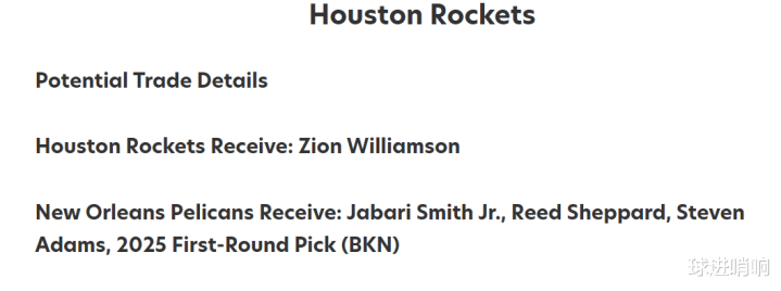 减重+三双+比肩老詹!火箭队该抢锡安?美媒《fadeawayworld》送4换1方案,打包交易小贾+谢泼德。
